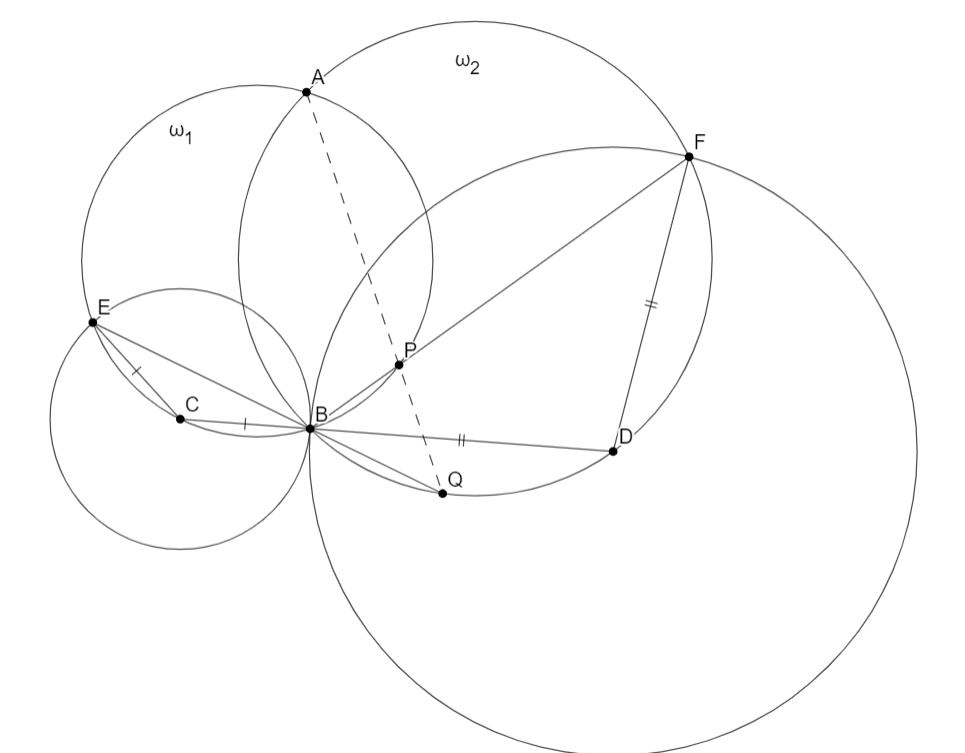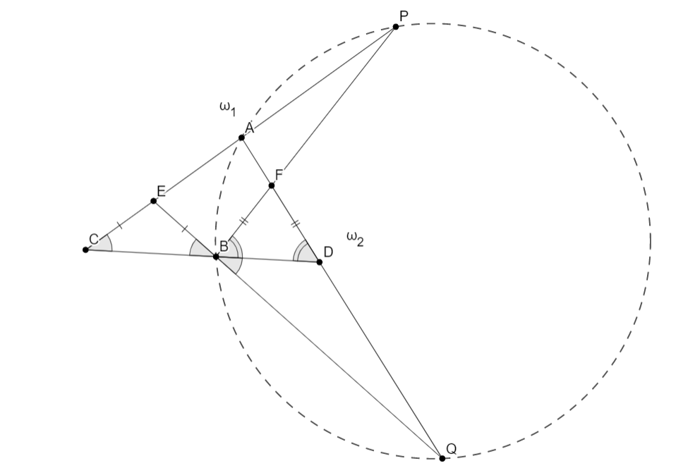 Сделаем инверсию в точке $B$. Тогда получаем: $(AECP)$ , $(AFDQ)$ , $(BCD)$, $(BFP)$, $(BEQ)$ - прямые. До инверсии $\angle CBE = \angle CEB$ и $\angle DFB=\angle DBF$, значит после инверсии $\angle CBE = \angle BCE$ и $\angle FDB=\angle FBD$. Тогда нужно доказать, что после инверсии $B,A,P,Q$ - лежат на одной окружности. $\angle PBQ=\angle FBD + \angle DBQ=\angle FDB + \angle EBC$, $\angle PAQ = \angle ECB + \angle FDB$, как внешний для треугольника $ACD$. Исходя из этого $\angle PBQ = \angle PAQ$, и очевидно, что до и после инверсии $P,Q$ - лежали на одной полуплоскости от $AB$, значит $B,A,P,Q$ - лежат на одной окружности и $A,P,Q$ до инверсии лежат на одной прямой.