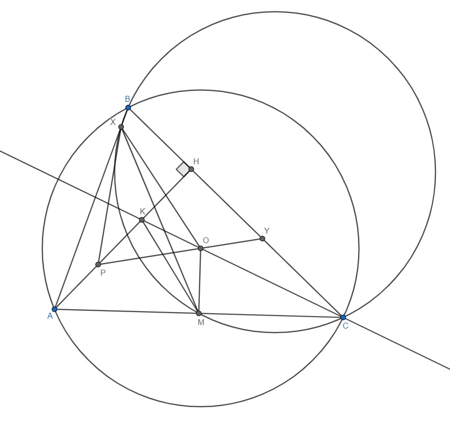 Докажем что $XPO, \ AXM$ подобны это докажет что $\angle XOP = \angle ABC$ ($BXOY$ вписанный), для этого докажем что $AXP,XOM$ подобны так как $\angle OMX = 90-\angle AMX = 90 - \angle ABC = \angle XAP$ то есть надо доказать что $\dfrac{AX}{AP}=\dfrac{2AX}{AK}=\dfrac{MX}{MO}$ выражая $AK=\dfrac{ACcos(\angle B)}{sin(\angle B+\angle C)}, \ AX=\dfrac{ACsin(\angle B)}{2sin( \angle C)}, \ XM=\dfrac{ACsin(\angle A)}{2sin(\angle C)} , \ MO=\dfrac{ACcos(\angle B)}{2sin(\angle B)}$