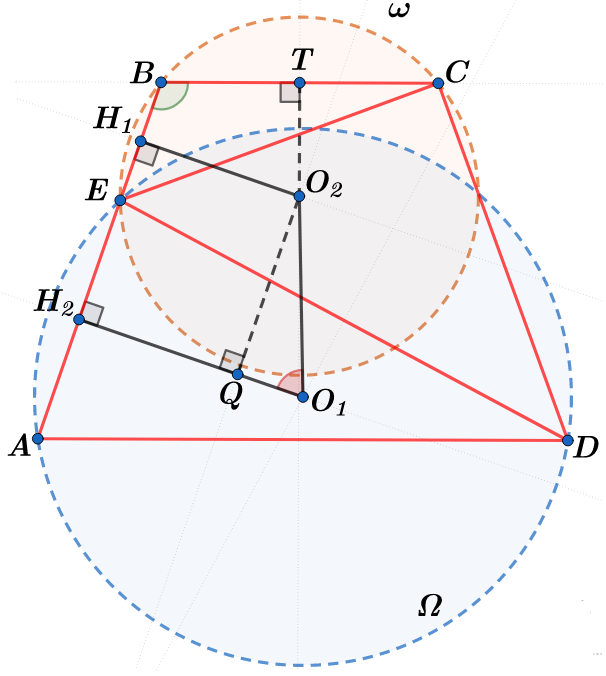 $$\omega: O_1H_1\bot EB , (H_1 \in AB) \Leftrightarrow BH_1=EH_1 \qquad \Omega:O_2H_2\bot AE, (H_2 \in AB) \Leftrightarrow AH_2=EH_2 $$