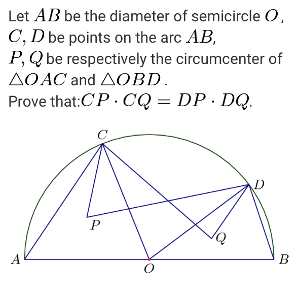 $\triangle APO: \frac{AP}{\sin a} = \frac{AO}{\sin 2a} \: ; \: \triangle BQO: \frac{BQ}{\sin b} = \frac{BO}{\sin 2b} \Rightarrow \frac{AP}{BQ} = \frac{\cos b}{\cos a}$
