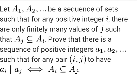 Пусть $A_1,A_2, \ldots$ последовательность множеств таких, что для любого натурального $i$ существует лишь конечное число значений $j$ таких, что $A_j\subseteq A_i$. Докажите, что существует последовательность натуральных чисел $a_1,a_2, \ldots$ таких, что для любой пары $(i,j)$ выполнено: $a_i\mid a_j$ тогда, и только тогда, когда $A_i\subseteq A_j$.