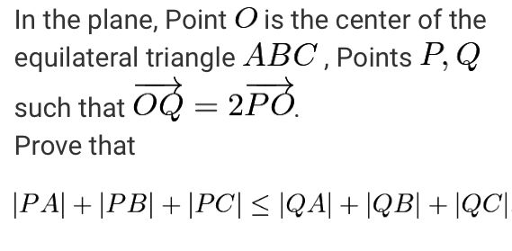 На плоскости дан правильный треугольник $ABC$, точка $O$ — его центр. Точки $P,Q$ лежат на плоскости так, что $\overrightarrow{OQ}=2\overrightarrow{PO}$. Докажите неравенство $|PA|+|PB|+|PC|\le |QA|+|QB|+|QC|.$