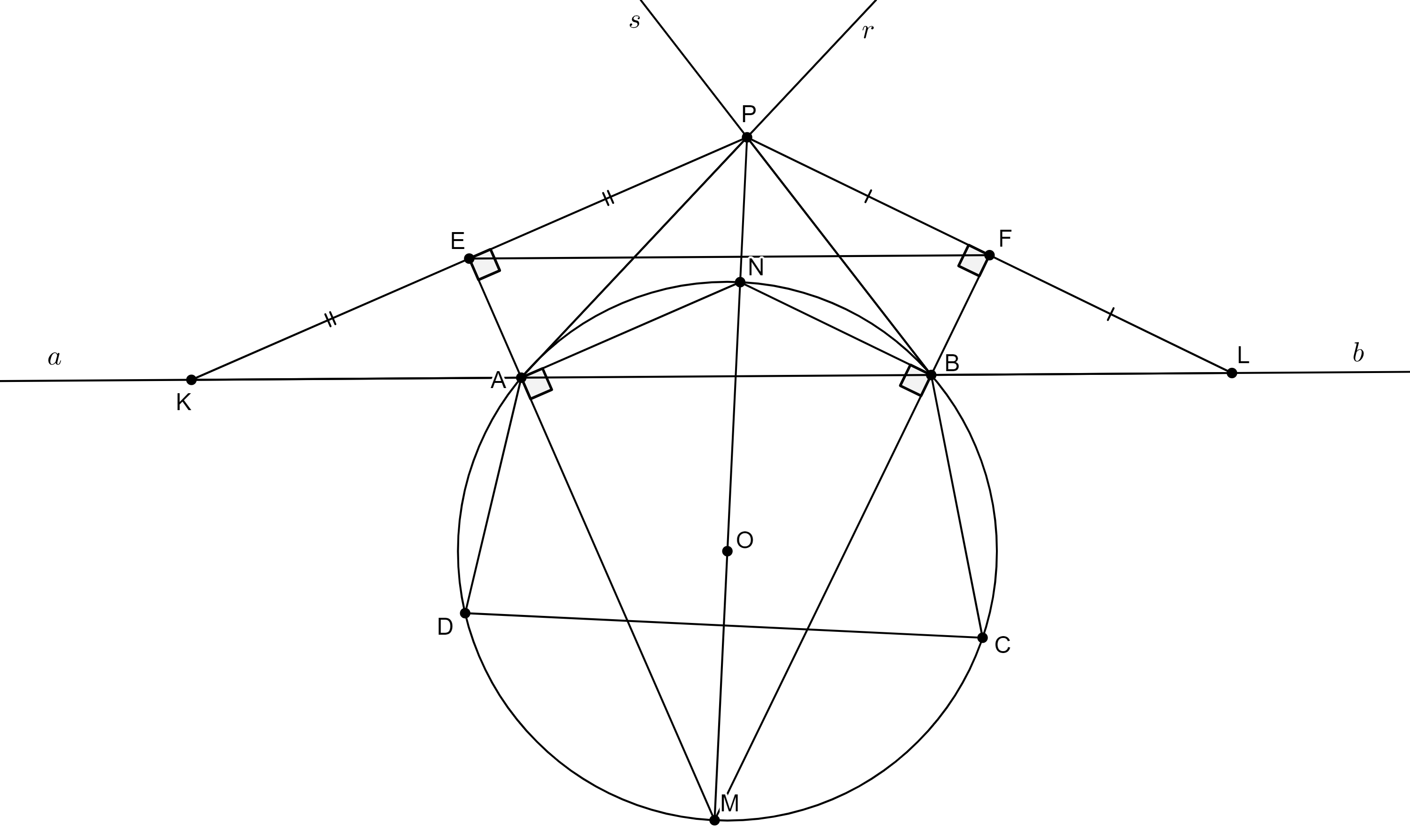 Пусть $M$ - середина дуги $CD$ без $A$, N - середина дуги $CAD$, $K$ - точка симметричная $P$ относительно биссектрисы угла $\angle CAD$ (т.е. $AM$), и по условию также лежащая на $a$, $L$ - точка симметричная $P$ относительно биссектрисы угла $\angle CBD$ ($BM$), также лежащая на $b$, $E$ - середина $PK$, $F$ - середина $PL$.