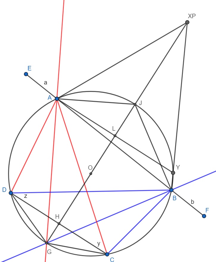 3) Значит $\angle YXL=\angle AXL=\angle AXJ=90^{\circ}-\angle BGJ-\angle AGJ$ откуда $\angle XYA=\angle XAY=\angle 90^{\circ}-\angle YXL=\angle BGJ+\angle AGJ$, но $\angle AYB=180^{\circ}-\angle AGB=180^{\circ}-(\angle AGJ+\angle BGJ)$ значит $Y$ лежит на $BX$ откуда $\angle YBJ=\angle AGJ$ так как $AJ=JY$ с другой стороны $\angle JBA=\angle AGJ $ значит $BJ$ биссектриса $\angle ABX$ и точка $X$ и $P$ совпадают. Откуда $OP \perp CD$.