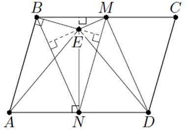 Решение. Обозначим через $N$ середину отрезка $AD.$ Поскольку треугольник $AED$ равнобедренный, $EN \perp AD.$ Так как $AB \parallel MN$ и $\angle ABE = 90^\circ ,$ то $BE \perp MN.$ Таким образом, $E$ --- точка пересечения высот треугольника $BMN.$ Значит, $ME \perp BN.$ Так как $BMDN$ --- параллелограмм, $BN \parallel DM,$ откуда $\angle DME = 90^\circ.$