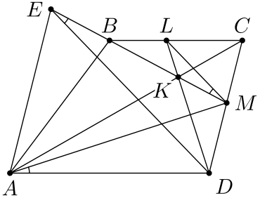Пусть $AM$ пересекает $BC$ в точке $E,$ а $BM$ пересекает $AD$ в точке $F.$ Достаточно доказать, что $\angle BML=\angle BEM,$ что равносильно с