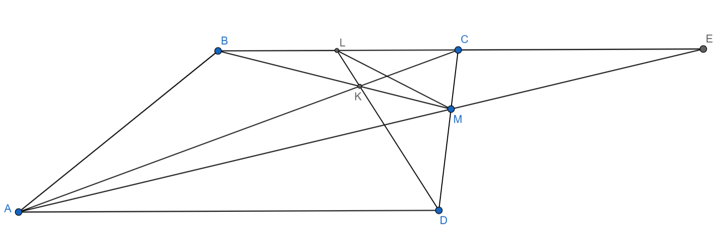 Пусть $E \in AM \cap BC$ , $\angle ADC = D$ тогда $\angle DAM = \angle BEM$ , запишем теорему Менелая для секущей $AC$ треугольника $MBE$ и для секущей $DL$ треугольника $BMC$ получаем соответственно $\dfrac{CE}{CB } \cdot \dfrac{BK}{MK} \cdot \dfrac{AM}{AE} = 1$ и $\dfrac{CL}{BL} \cdot \dfrac{BK}{MK} \cdot \dfrac{DM}{CD}=1$. Так как $\dfrac{AE}{AM} = \dfrac{CD}{DM}$ получаем что $\dfrac{CE}{CB} = \dfrac{CL}{BL}$ которую можно записать как $\dfrac{\sin(D+ \angle BML)}{sin \angle BML} = \dfrac{\sin(D+\angle DAM)}{sin \angle DAM}$ (пользуясь тем что $BM=BC$) откуда $\angle DAM = \angle BML$ или $CM$ биссектриса угла $EML$.