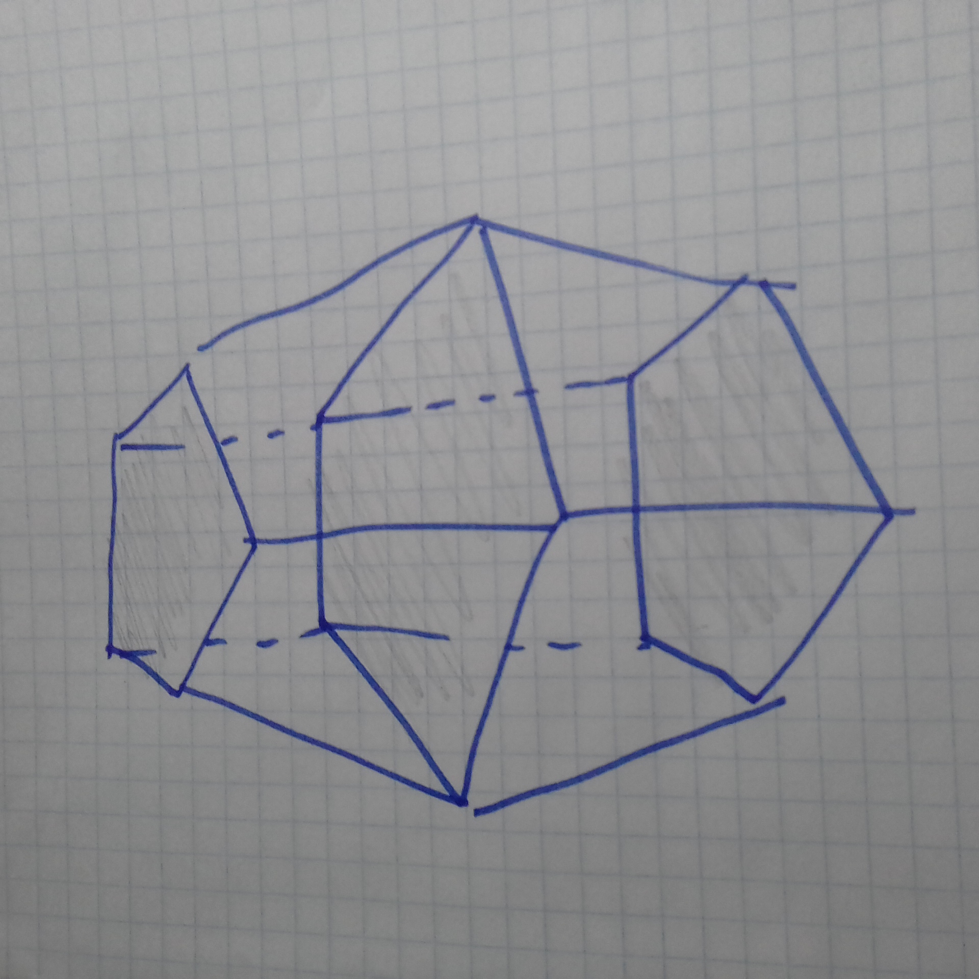 Представьте себе три выпуклых пятиугольника ,которые не равны между собой и средний из них находится между двумя другими.соединим вершины ребрами. Получим $5*3+5+5=25$ ребер .