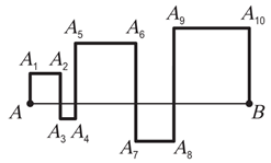 $AB$ кесіндісі суретте көрсетілгендей сынық сызықпен кесілген. Бұл ретте 5 шаршы пайда болды. $AB$ 10-ға тең болса, $A{{A}_{1}}{{A}_{2}}\ldots {{A}_{10}}B$ сынығының ұзындығы нешеге тең?