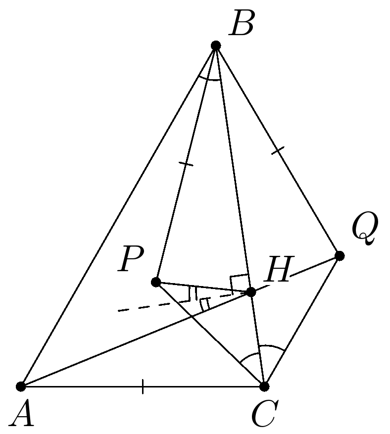 Решение. Отложим на продолжении отрезка $AH$ за точку $H$ отрезок $HQ = HP.$ Поскольку биссектрисы смежных углов взаимно перпендикулярны, прямая $BC$ является биссектрисой угла $PHQ$, смежного с углом $AHP$ и, значит, серединным перпендикуляром к $PQ$. Поэтому $\angle ABC = \angle HCP = \angle HCQ = \angle BCQ,$ откуда получаем, что прямые $AB$ и $CQ$ параллельны. Заметим, что при этом прямые $AC$ и $BQ$ не параллельны, так как иначе точка $H$ пересечения диагоналей параллелограмма $ABQC$ была бы, вопреки условию, серединой отрезка $BC.$ Так как, кроме того, $AC = BP = BQ,$ получается, что $ABQC$ — равнобедренная трапеция, и равенство $AH = BH$ — ее известное (и легко доказываемое) свойство.