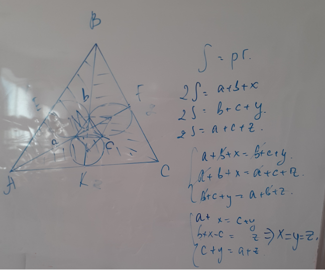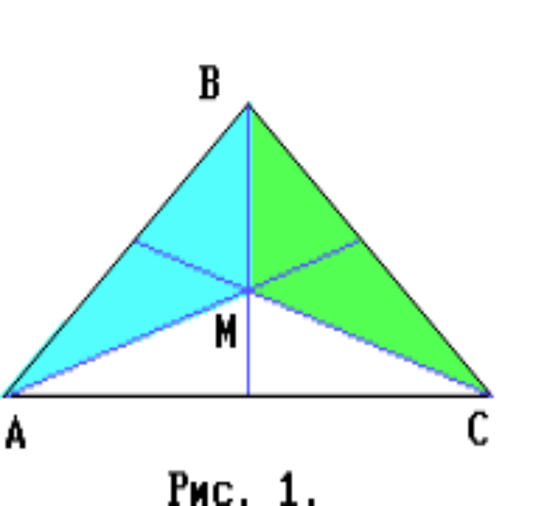 Поскольку площади треугольников AMB, BMC и AMC равны (каждая из них составляет третью часть площади треугольника ABC), то из формулы S = pr следует, что равны и периметры этих треугольников (рис 1).