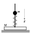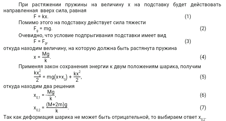 На подставке массой $M$ прикреплен невесомый стержень, по которому может скользить шарик массой $m$. К нижней точке подставки с одной стороны и к шарику с другой прикреплена пружина жесткости $k$, так что она нам намотана вокруг стержня и все время остается вертикальной. На шарик надавливают, вызывая в пружине начальное сжатие на величину ${{x}_{0}}$, и отпускают из состояния покоя. Найдите минимальное значение ${{x}_{0}}$ при котором подставка подпрыгнет. Ускорение свободного падения равно $g.$ (5 баллов)