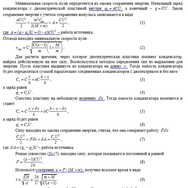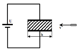 Сыйымдылығы $C$ жазық тікбұрышты конденсаторға, жапсарлар бойымен үйкеліссіз сырғанай алатын, өтімділігі $\varepsilon $ және массасы $M$ диэлектрлік пластина салынады. Конденсатор кернеуі $U$ тұрақты қорек көзіне қосылған. Уақыттың бір мезетінде массасы $m$ оқ диэлектрлікке тиеді және онда кептеліп қалып қояды. Оқтың қозғалыс бағытындағы конденсатор жапсарларының ұзындығы $h$-қа тең, оқтың өлшемдерін ескермеуге болады.