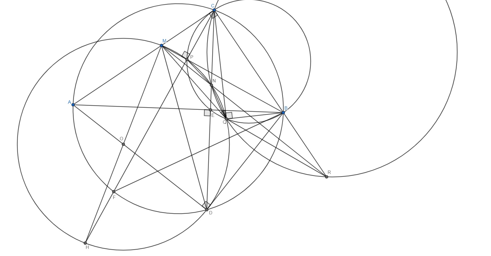 Так как $MPNQ$ вписанный откуда $\angle BPN = \angle MQN = \angle MDN$ так как $AB$ - диаметр то $BC=BD$ и так как $CP \perp BM$ и $H \in CP \cap \omega_{1}$ то $MH$ -диаметр $ \omega_{1}$ учитывая то что $BD^2=BC^2=BP \cdot BM$ то $BD$ касательная к $\omega_{1}$ откуда $\angle DMN = \angle BDC = \angle BCD$ или $DMCR$ вписанный где $R \in MN \cap BC$ и так как $\angle MPQ = \angle MNQ$ то $\angle BCQ = \angle RNQ$ то есть $RCNQ$ вписанный значит $\angle BPN = \angle MQN = \angle MDN = \angle MRC = \angle CQN$.