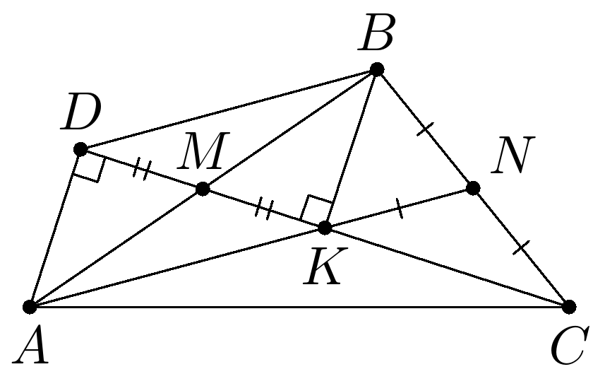 Точки $M$ и $N$ — середины сторон $AB$ и $BC$ соответственно треугольника $ABC.$ На продолжении отрезка $CM$ за точку $M$ отмечена точка $D.$ Оказалось, что $BC = BD = 2$ и $AN = 3.$ Докажите, что $\angle ADC = 90^\circ.$