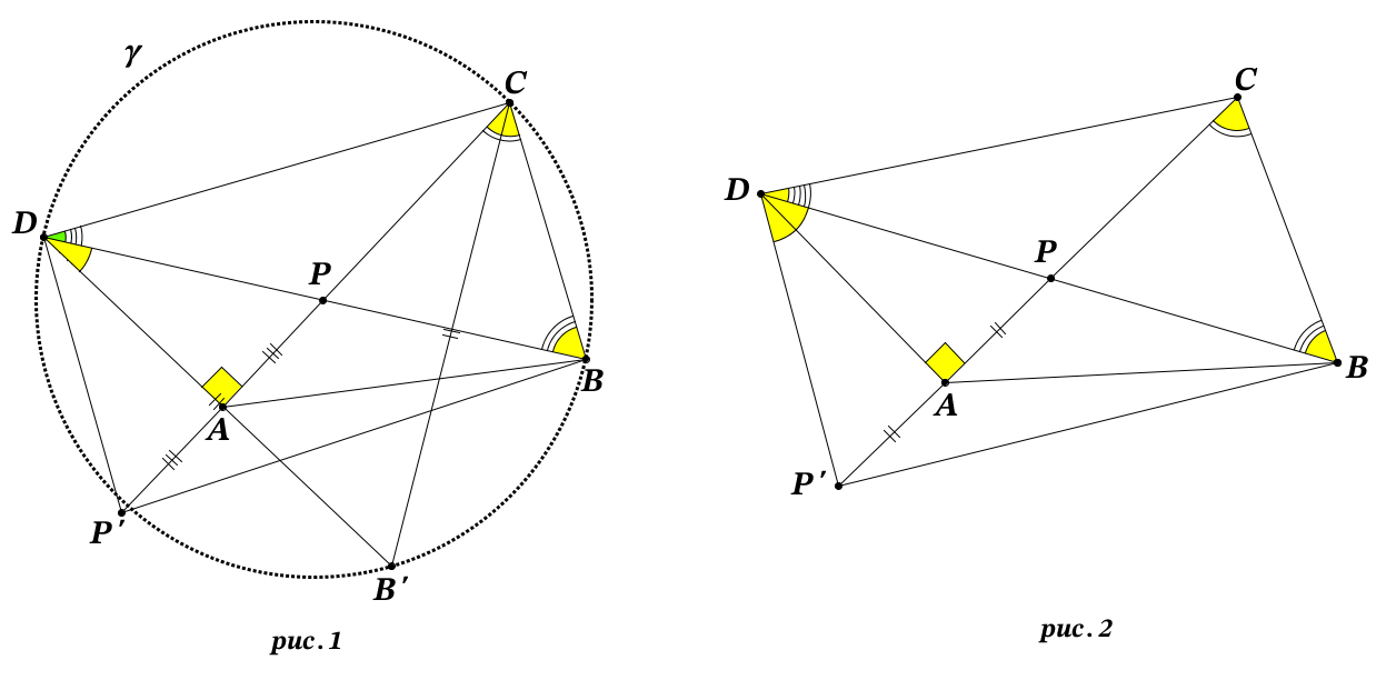 $\textbf{Решение №3}$ $\textit{(Рис.1)}$ На прямой $AD$ отметим точку $B'$ так, что $DB'=CB''$. Тогда из условия $ \angle DBC + 2 \angle ADC = 180 ^ {\circ} $ следует, что четырехугольник $ BCDQ $ является вписанным. Отсюда следует, что $ \angle B'CP = \angle B'DP $ или $ \angle B'CB = \angle ADB $, то это означает, что $PC=PD$. Теперь отметим точку $P'$ на прямой $AP$ так, что $P'A=AP$. Следовательно, $ BCDP' $ является вписанным, значит, $ PB = PP'=2AP $. Что и требовалось доказать.