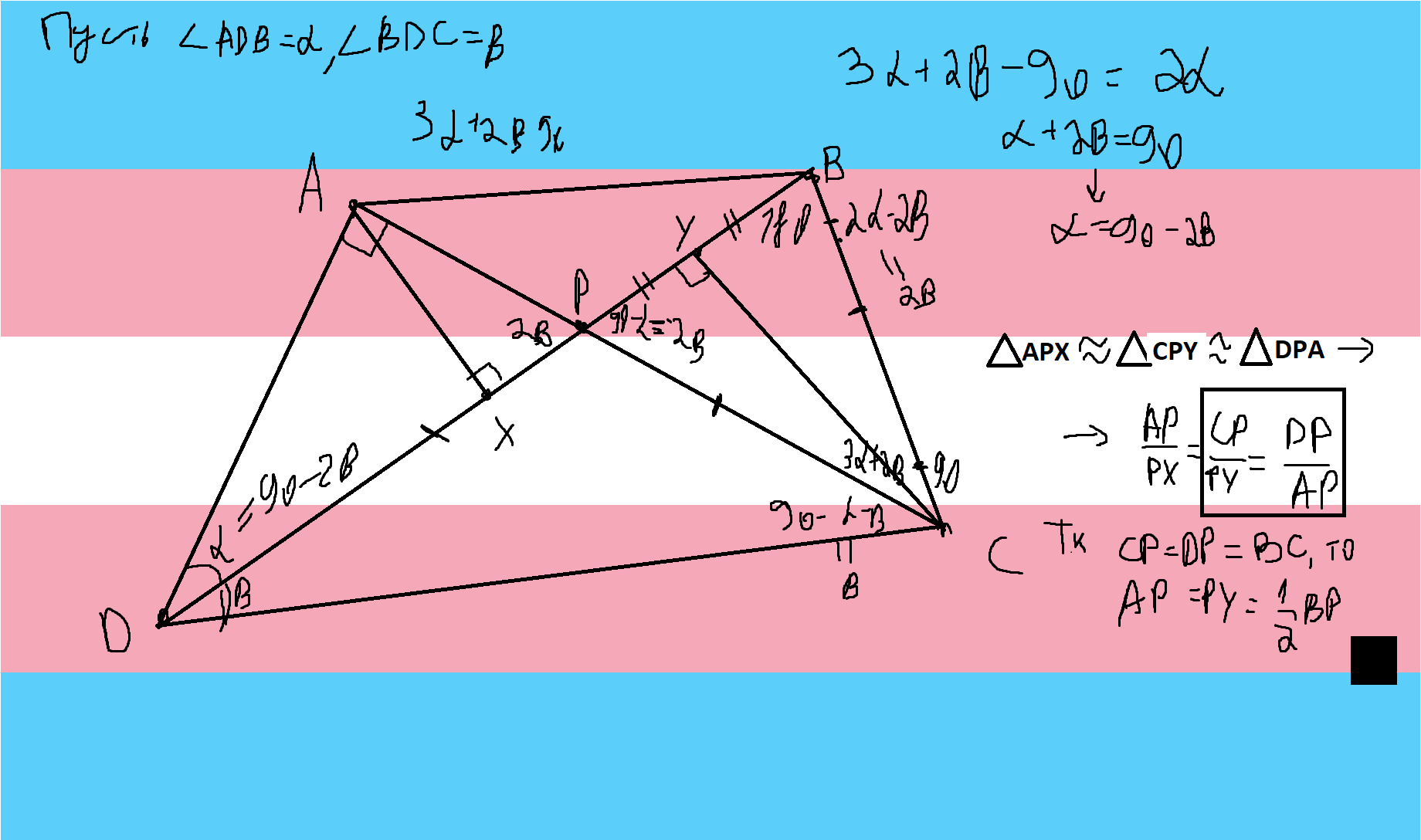 Несложно догадаться до свойства, что если из противоположных концов двух пересекающихся отрезков опустить на них высоты, то образованные прямоугольные треугольники будут подобны. Опустим из $A$ высоту $AX$, аналогично поступим и с $CY$. Тогда, $PY=YB$, т.к $\triangle PCB$ - равнобедренный. $\triangle APX \sim \triangle CPY \sim \triangle DPA \Rightarrow \frac{AP}{PX} = \frac{CP}{PY} = \frac{DP}{AP}$, и тогда, из равенства последних двух дробей получаем $PY=AP=\frac{1}{2}BP$, что и требовалось доказать.