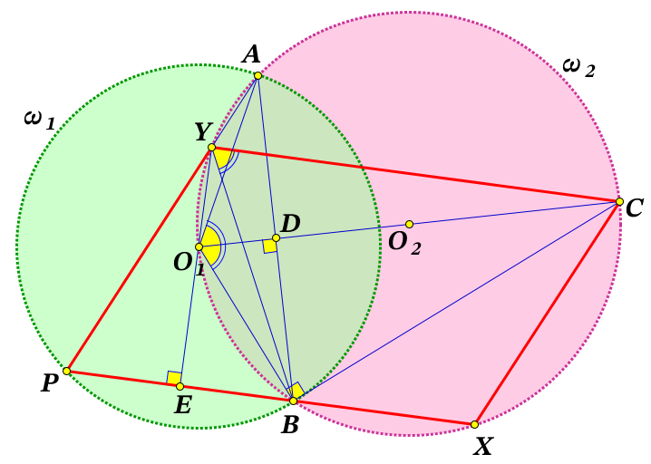 Заметим, что $O_{1}P=O_{1}A$ т.к. радиус. Тогда $\angle{O_{1}AY}=\angle{O_{1}PA}$ Так же известно, что $\angle{O_{1}BP}=\angle{O_{1}PB}$