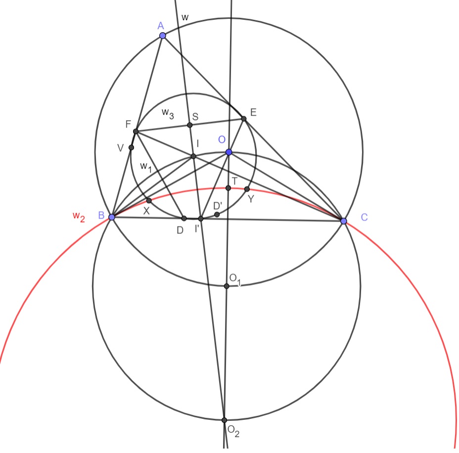 Пусть $w_{2}$ окружность с радиусом $O_{2}B=O_{2}C$ проведем биссектрису $l$ из точки $A$ и пусть $M \in l \cap w_{1}$ ,тогда $\angle BMC = 180^{\circ}-\angle BAC = 120^{\circ}$ тогда $M=I$ где $I$ - инцентр, пусть $I' \in O_{2}I \cap BC$ тогда по свойству инверсий, относительно $w_{3}$ луч $BC$ образ $w_{1}$ так как $\angle OIO_{2} = 90^{\circ}$ так как $OO_{2}$ диаметр, откуда $\angle OIC = \angle OBC = 30^{\circ}$ значит $\angle CIO_{2} = 60^{\circ}$ следовательно $IO_{2}$ биссектриса $\angle BIC$. По условию $CF, BE$ биссектрисы, тогда $\angle FIB = 60^{\circ}$ тогда $\Delta BII' = \Delta BIF$ по двум углам и стороне $BI$ откуда $BI'=BF$ и $IF=II'$ аналогично $IE=II'$ и $CI'=CE$ учитывая что $\angle FII' = \angle EII' = 120^{\circ}$ значит $FEI'$ правильный откуда $\angle BFE = \angle BI'E$ . Пусть $w_{3}$ окружность с центром $I$ и $R=II'$. Пусть $D \in w_{3} \cap BC$ тогда $\angle BFD = \angle BFE - \angle DFE = \angle BI'E - \angle EI'C = 180^{\circ} - 2 \angle EI'C = \angle ACB$ то есть $FDCA$ вписанный, откуда $\angle AFE = \angle DFE$ аналогично $\angle AEF = \angle FED$ тогда $AF=DF, \ AE=DE$ то есть $D$ симметрична $А$ относительна $FE$.