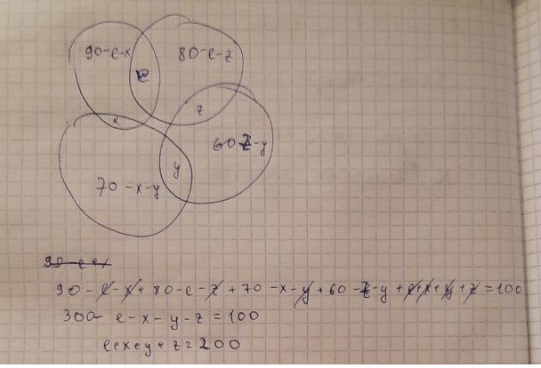 100 оқушы қатысқан «Жібек Жолы» олимпиадасында төрт есеп берілді. 1-есепті 90 оқушы, 2-есепті 80 оқушы, 3-есепті 70 оқушы, 4-есепті 60 оқушы шығарды. Ешбір оқушы төрт есептің бәрін шығара алмады. Неше оқушы дәл үш есептен шығарды? Жауабыңызды негіздеңіз.