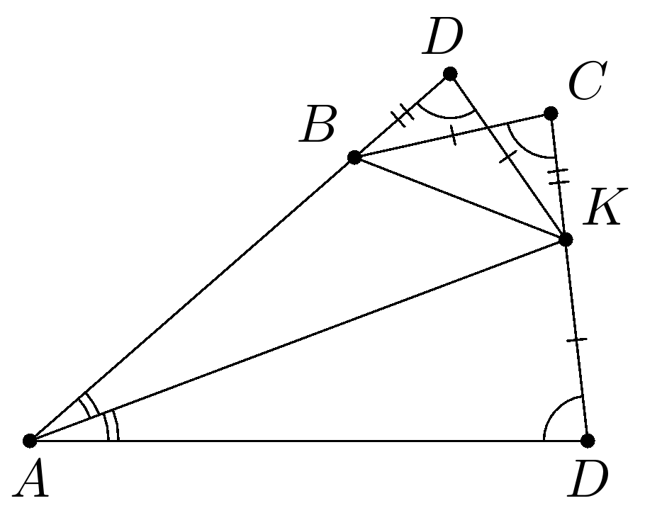 Комментарии от администратора Комментарии от администратора №1. Пусть точка $D'$ симметрична $D$ относительно прямой $AK.$ Тогда $BC = DK = D'K$ и $KC = AD-AB = AD'-AB = BD',$ откуда следует равенство треугольников $BD'K$ и $BCK$ по трём сторонам. Тогда $\angle BCK = \angle BD'K = \angle AD'K = \angle ADK = \angle ADC.$