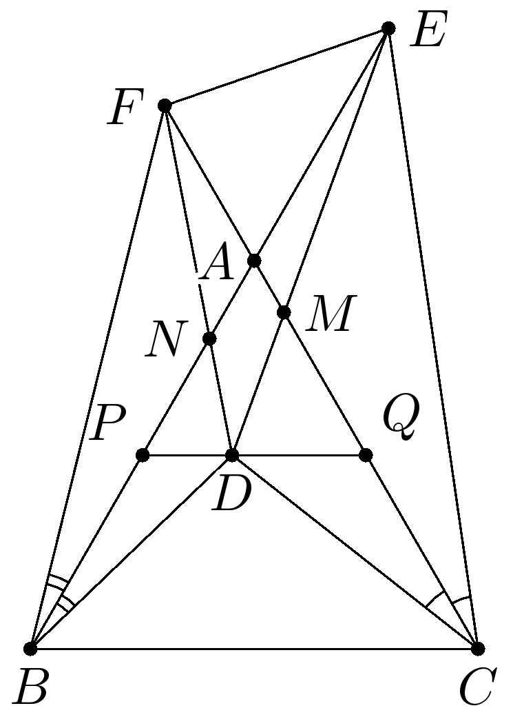 Комментарии от администратора Комментарии от администратора №1. Обозначим через $P$ и $Q$ середины сторон $AB$ и $AC,$ а через $M$ и $N$ — точки, в которых $DE$ и $DF$ пересекают стороны $AC$ и $AB$ соответственно. Тогда треугольник $DPB$ будет подобен треугольнику $FAB$ по двум углам ($\angle DBP = \angle FBA$ по условию, $\angle BPD = \angle BAF = 120^\circ$) с коэффициентом 2, поскольку $AB = 2PB.$ Тогда по свойству биссектрисы $DN/NF = DB/BF = 1/2.$ Аналогично $DM/ME = 1/2.$ Следовательно, $S_{FAE} = 2S_{FDA}$ (так как сторона $AF$ у треугольников общая, а отношение опущенных на нее высот равно $DM/ME = 1/2$) и, аналогично, $S_{FAE} = 2S_{EDA},$ откуда $S_{FDE} = 2S_{FAE},$ и потому высота из вершины $A$ на $EF$ вдвое меньше высоты из вершины $D$ на $EF,$ откуда и вытекает утверждение задачи.