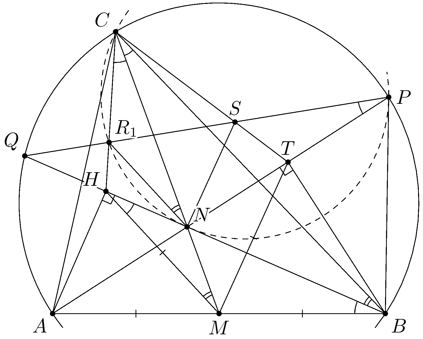 Пусть отрезки $CH$ и $PQ$ пересекаются в точке $R_1.$ Тогда из $\angle HCN = \angle MHN = \angle MBN = \angle ABQ = \angle APQ$ следует, что четырехугольник $CR_1NP$ вписанный. Из последнего получим $\angle CNR_1 = \angle CPR_1 = \angle CBQ = \angle CMH$, то есть получим параллельность $MH \parallel NR_1$. Тогда $\angle NR_1C = \angle MHC = \angle BNC (1)$. Но на отрезке $QR_1$ не существует иной точки $R_1$, для которой выполнено равенство (1). Значит, точки $R$ и $R_1$ совпадают. А для точки $R_1$ как раз выполнено $\angle NR_1C = \angle BNC$ и $RN = R_1N = MH \cdot \dfrac{CN}{CM}.$ Аналогично доказывается, что $SN = MT \cdot \dfrac{CN}{CM}$. Но так как $MH = MT$, то и $RN = SN$.