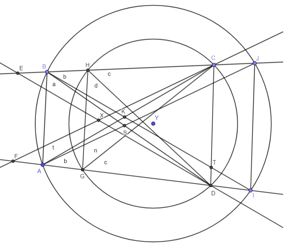 Построим две концентрические окружности с центром в точке $O$ и радиусами $(\omega_{R}, \omega_{r}) , R>r$ пусть $A,B,J,I$ точки на $ \omega_{R}$ и пусть $H,C \in BJ \cap \omega_{r}, \ G,D \in \ AI \cap \ \omega_{r} $, проведем $ED || BI$ и $CF || AJ$ где $E \in BJ, \ F \in AI$ пусть $X \in ED \cap CF$