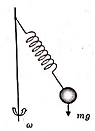 (7 баллов). На пружину жесткости $k$ и начальной длины $l_0$ подвешен шарик массы $m$. Система находиться над центром платформы центробежной машины (см. рисунок). Когда машину приводят в движение, шарик начинает вращаться вместе с ней с угловой скоростью $\omega$. Считая пружину идеальной, определите угол $\alpha$, который образуется между пружиной и вертикалью.