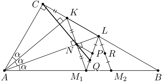Пусть $P$ — середина отрезка $LM_1,$ $R$ — середина отрезка $LM_2,$ а $Q$ — точка пересечения прямой $CN$ с отрезком $M_1L.$ Поскольку $\triangle ACK = \triangle ANK,$ $KC = KN,$ откуда $CN \perp AK$ и $\angle M_1NQ = \angle KNC = \angle KCN = \alpha < 2\alpha = \angle M_1NP.$ Таким образом, точка $Q$ лежит между точками $M_1$ и $P,$ следовательно, прямая $CQ$ не может проходить через точку $P.$ Через точку $R$ прямая $CQ$ также не может проходить, поскольку $\angle CQL+\angle LQR < \angle CPL+\angle LPR < 180^\circ.$