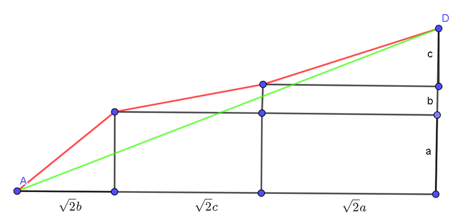 \sqrt{(\sqrt{2b^2} + \sqrt{2c^2} + \sqrt{2a^2})^2} = \sqrt{2}(\sqrt{a^2} + \sqrt{b^2} + \sqrt{c^2})