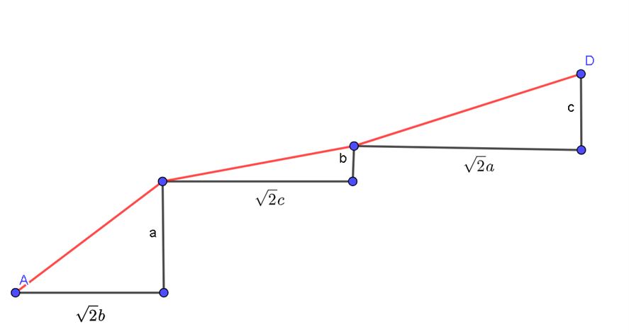 Длина ломаной AD, которая была составлена из гипотенуз данных треугольников, согласно теореме Пифагора будет равна