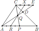 Решение. Проведем через точку $C$ прямую, параллельную прямой $AB$, и пусть $E$ — точка ее пересечения с прямой $AD$. Искомая точка $X$ — это середина отрезка $CE$. В самом деле, точки $R$, $Q$ и $X$ лежат на одной прямой при любом выборе точки $P$ как середины сторон и точка пересечения диагоналей трапеции $APEC$.