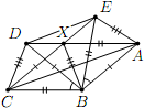 Комментарии от администратора Комментарии от администратора №1. Заметим, что $AB = CX = BD;$ $BC = AX = BE$ и $\angle ABD = 180^\circ-2\angle BAD = 180^\circ-2\angle BCE = \angle CBE,$ откуда $\angle ABE = \angle CBD.$ Следовательно, треугольники $ABE$ и $DBC$ равны по двум сторонам и углу между ними, поэтому $AE = CD.$