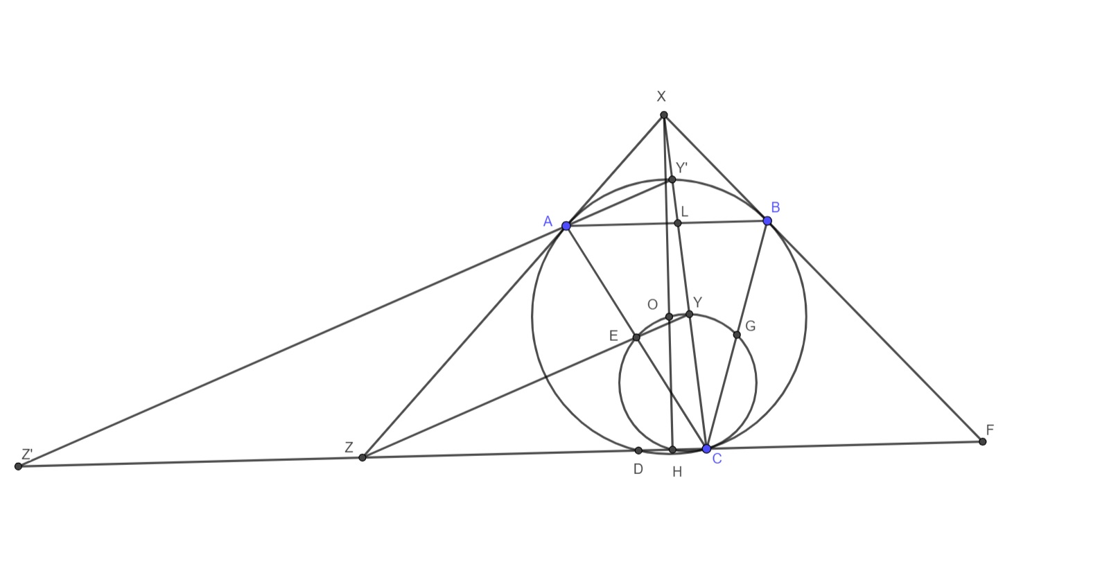 $F \in BX \cap ZC$ если $H$ середина $ZF$ тогда $CHOY$ вписан в $\omega_{1}$ если $E \in \omega_{1} \cap AC, \ G \in \omega_{1} \cap BC$ тогда при гомотетий $(C,2)$ $\omega_{1} -> \omega$ если $Y -> Y'$ покажем что если $Z' \in Y'A \cap CZ$ тогда $ZZ' = ZC$ вытекает из того что $AB$ поляра точки $X$ значит если $L \in XC \cap AB$ тогда точки $(XL, Y'C)=1$ образуют гармоническую четверку то есть $\dfrac{CL}{LY'} = \dfrac{CX}{XY'}$ откуда $ZZ'=ZC$ значит $E$ середина $AC$ и $E \in ZY$ так как переходит в $Z'Y'$.