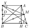 Решение. Проведем в треугольнике $ABC$ высоту $AH$. Утверждение задачи немедленно вытекает из равенства $AC = BH$, которое мы и будем доказывать. Проведем медиану $MD$ равнобедренного треугольника $BMX$. Она является средней линией трапеции (или параллелограмма) $AXBC$, и потому параллельна прямым $BC$ и $AX$. Так как эта медиана является в $BMX$ также и высотой, прямая $BX$ перпендикулярна ей, а потому и прямым $BC$ и $AX$. Следовательно, $BXAH$ — прямоугольник, откуда $BH = AX$. С другой стороны, $\angle CXA = \angle XCB = \angle XCA$, откуда $AC = AX = BH$, что нам и требовалось.