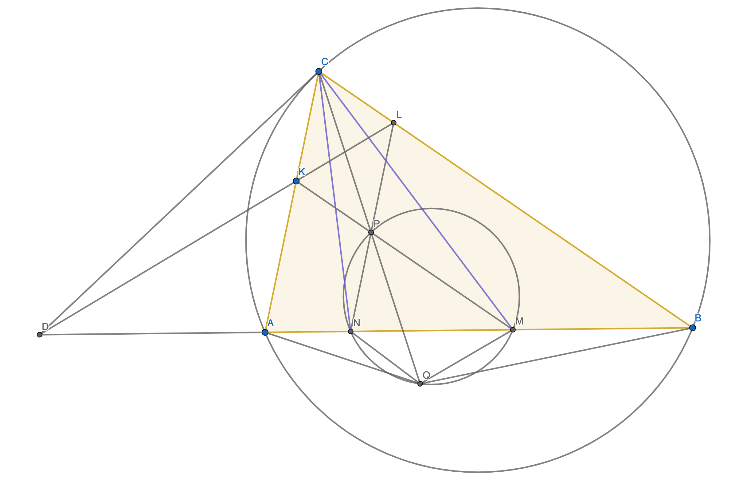 Не сложным счетом углов можно понять что $\angle AQN = \angle BQM$ учитывая это также не сложно убедится что $(AQB)$ и $(NQM)$ касаются и их радикальная ось это касательная в точке $Q$ но из (i) мы знаем что у $D$ одинаковая степень точки относительно этих окружностей значит их радикальная ось пройдет через $D$.