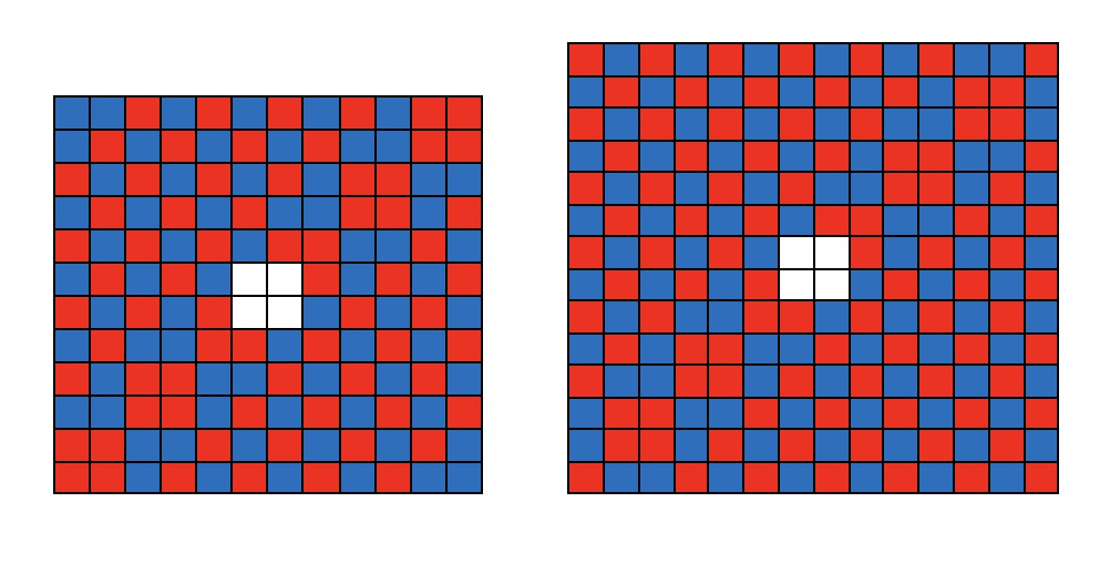 Теперь пример для $4n^2-4$. Главная идея заключается в том, что если перекрасить шахматный квадратик $2\times 2$ (или любые 4 точки которые образуют шахматный прямоугольник), то это сохранит условие 1 и почти сохраняет условия 2 и 3. Осталось придумать пример. Когда $n=1$ или $n=2:$