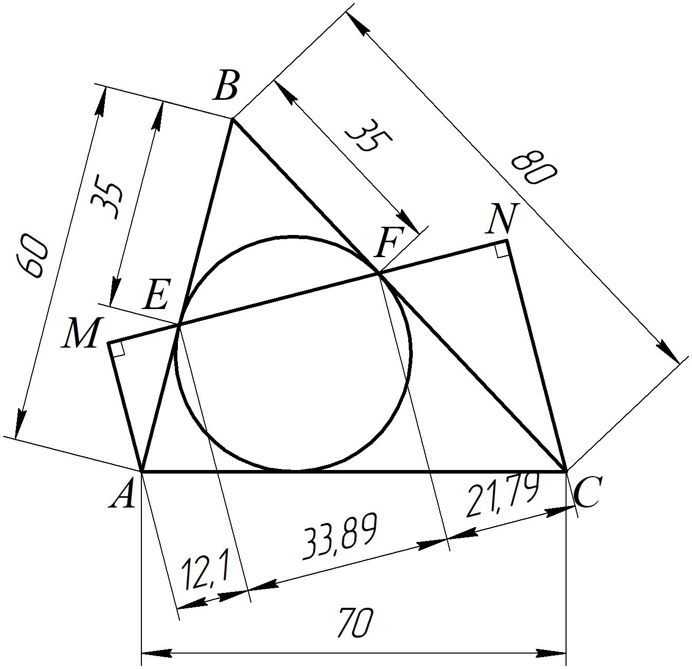 Пусть $\angle BFE = \alpha$, тогда $\angle BFE = \angle BEF = \angle MEA = \angle NFC = \alpha$. Заметим что $2AC = AB + BC$, пусть $BE = BF = x, AE = z, FC = y$, тогда $AC = AE + CF = z + y = (x + y + x +z)/2$, откуда $z + y = 2x$. По теореме синусов для треугольника $BEF$ получим $\frac{x}{\sin \alpha} = \frac{EF}{\sin (180^\circ - 2\alpha)} = \frac{EF}{\sin 2\alpha} = \frac{EF}{2\sin \alpha \cos \alpha}$, откуда $\frac{EF}{\cos \alpha} = 2x$. В треугольниках $MEA, CNF$ получим $\frac{ME}{\cos \alpha} = z$, $\frac{FN}{\cos \alpha} = y$ соответственно, откуда следует что $ME+ FN = EF$.