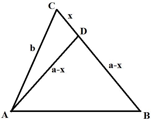 Енді $BC>AC$ жағдайын қарастырайық (жалпылыққа әсер етпейді). $BC=a> AC=b $. BС қабырғасының бойынан $AD=BD$ болатындай D нүктесін белгілейік. $CD=x$ болсын. Онда $BD=a-x=AD, \ \ \angle CAD=\angle A -\angle B$ болады.