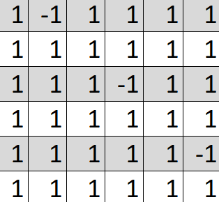 б) Для любого столбца и строки найдется хотя бы $1$ число $-1$, и это число задействовано в другом столбце/строке $1$ раз, $\Rightarrow$ Количество $-1\geq2k/2=k$, где $n=2k$ Пример для k: