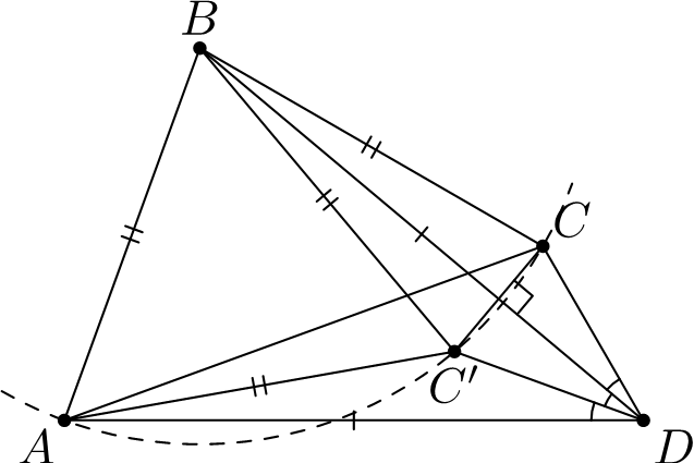 Комментарии от администратора Комментарии от администратора №1. Пусть точка $C'$ симметрична точке $C$ относительно $BD$. Тогда $BC = BC'$ и $\angle CDB = \angle BDC'$. Откуда из условия задачи следует, что $\angle BDC' = \angle C'DA$, то есть $C'$ лежит на биссектрисе угла $BDA$.