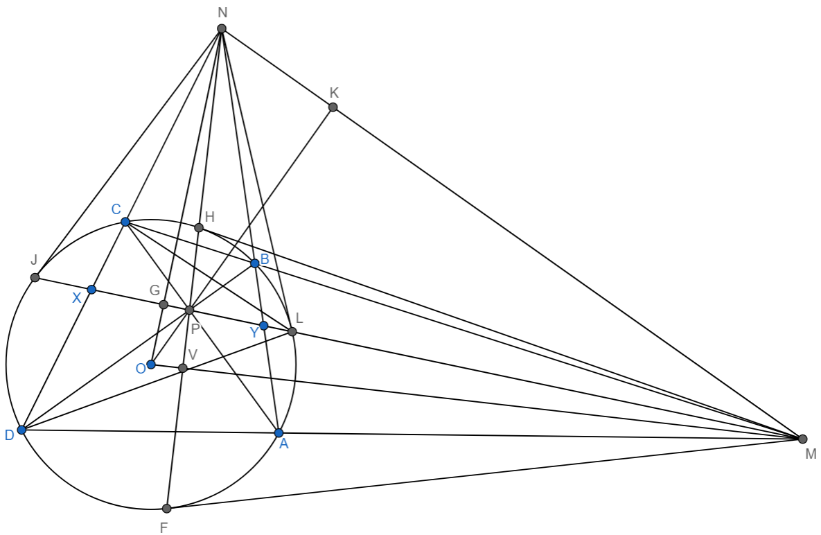 Доказательство: Пусть отрезок $JL$ пересекает прямые $ND,NO,NA$ соответственно в точках $X,G,Y$ тогда точка $G$ сопряженная относительно данной окружности точке $N$ так как $OG \cdot ON=R^2$ ($R$-радиус окружности) , тогда $JL$ поляра точки $N$, значит любая секущая проходящая через точку $N$ будет образовывать гармоническую четверку, в данном случае $(CD,NX)=1$ или $\dfrac{DX}{CX}=\dfrac{DN}{CN}(1)$ .
