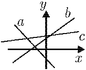 Задача №1. Три прямые $a,b,c$ на рисунке ниже имеют угловые коэффициенты $A,B,C$ соответственно. Какое из чисел $A,B,C$ является:
