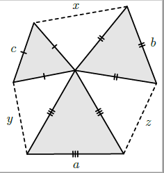 Задача №3. Три равносторонних треугольника с длинами сторон $a$, $b$, $c$, расположенные, как показано на рисунке, имеют общую вершину и не имеют других общих точек. Определим длины $x$, $y$, $z$, как показано на рисунке. Докажите, что $3(x+y+z) > 2(a+b+c).$