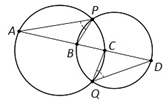 Задача №2. Две окружности пересекаются в точках $P$ и $Q$. Прямая пересекает эти окружности последовательно в точках $A$, $B$, $C$ и $D$, как показано на рисунке. Докажите, что $\angle APB=\angle CQD$.