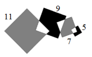 Задача №1. Квадраты со сторонами 11, 9, 7 и 5 расположены примерно так, как на рисунке ниже. Оказалось, что площадь серых частей в два раза больше, чем площадь черных частей. Найдите площадь белых частей.