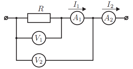 Задача №2. В электрическую схему, изображенную на рисунке, включены по два одинаковых вольтметра и амперметра. Показания измерительных приборов оказались следующими: $V_1=10,0$ B, $V_2=10,5$ B, $I_1=50$ мА, $I_2=70$ мА. Определите сопротивление резистора $R$. (5 баллов)