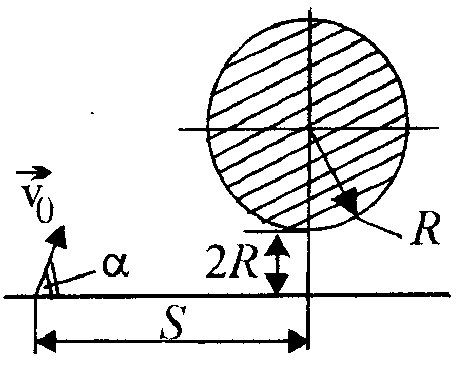 Есеп №1. Радиусы $R$ ауа шары Жер бетінен $2R$ биіктікте тыныштықта тұр (1-сурет). Жердің горизонталь бетінен лақтырылған тас шардың жоғарғы нүктесін жанап, шарды асып кетуі үшін, оны қандай $\vartheta_0$ минималды жылдамдықпен, қандай $\alpha$ бұрышпен және қандай $S$ қашықтықтан лақтыру қажет? Еркін түсу үдеуі $g$. (5 ұпай)