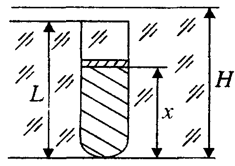 Есеп №2. Ұзындығы $L=1$ м түтікті $P_0=10^5$ Па қысымдағы атмосфералық ауамен толтырып, қозғалмайтын жеңіл поршенмен жауып, сұйығы бар ыдысқа $H=40$ м тереңдікке батырады (2-сурет). Түтік ұзындығының $\alpha=x/L$ қандай бөлігі газбен толтырылады? Температура тұрақты, қаныққан бу қысымы — мардымсыз аз, $\rho_{\max}=1,26$ г/см$^3$ (глицерин), $g=10$ м/с$^2$. (5 ұпай)